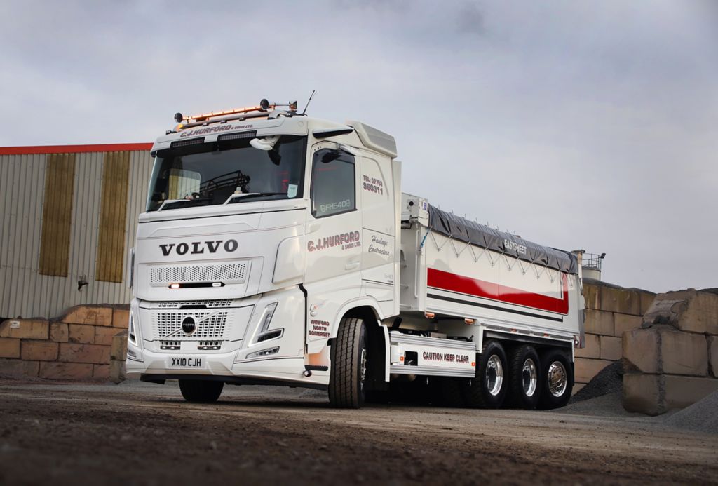 C J Hurford & Sons has taken delivery of a new Volvo FH Aero 8x4 Tridem tipper, the first truck of its kind to be put into operation in the UK.